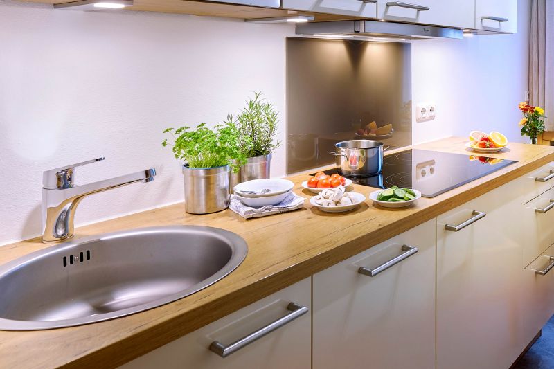 1 Küche, komplett ausgestattet mit Geschirrspüler, 4-Platten-Cerankochfeld, Kühlschrank, Mikrowelle mit Grillfunktion, Kaffeemaschine, Wasserkocher, Eierkocher, Toaster