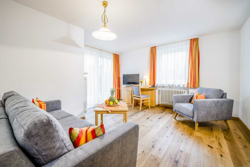 Bei uns können Sie Ihren Urlaub in liebevoll eingerichteten und rauchfreien Ferienwohnungen oder im Einzelzimmer verbringen. Die Unterkünfte verteilen sich auf das Appartementhaus und das Gästehaus, in dem auch der Aufenthaltsraum, der Billardraum und ein Hobbyraum mit einer Tischtennisplatte und Fitnessgeräten liegen. Die 5-Sterne-Ferienwohnung 5 - Gänseblümchen befindet sich im Erdgeschoss des Gästehauses und bietet Platz für bis zu 2 Personen.