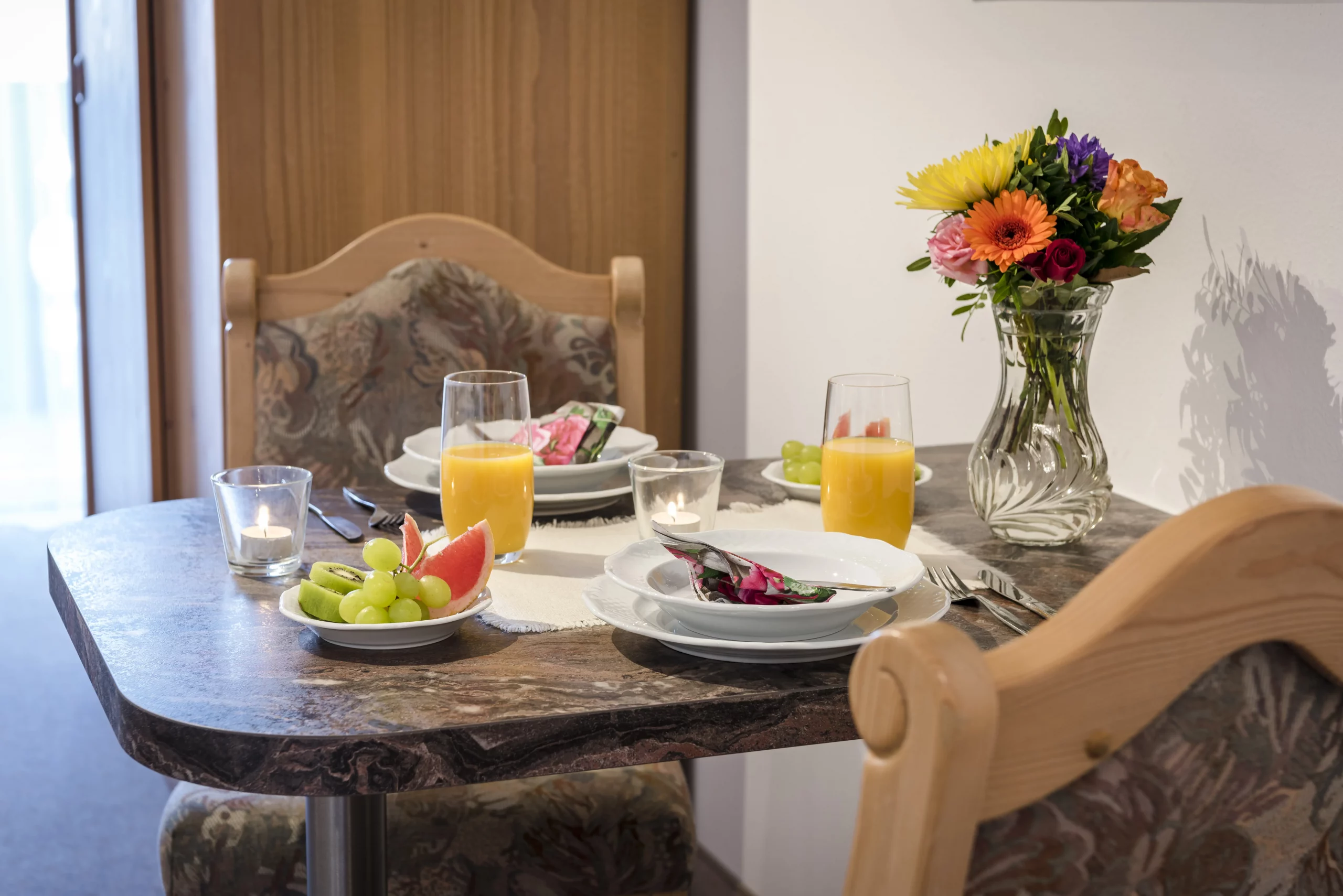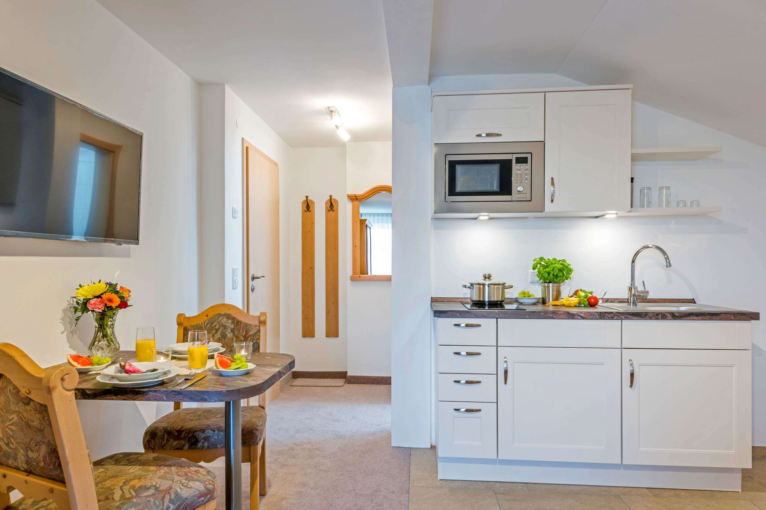 Bei uns können Sie Ihren Urlaub in liebevoll eingerichteten und rauchfreien Ferienwohnungen oder im Einzelzimmer verbringen. Die Unterkünfte verteilen sich auf das Appartementhaus und das Gästehaus, in dem auch der Aufenthaltsraum, der Billardraum und ein Hobbyraum mit einer Tischtennisplatte liegen. Die Ferienwohnung Veilchen befindet sich im zweiten Stock des Gästehauses und bietet Platz für 2 Personen.